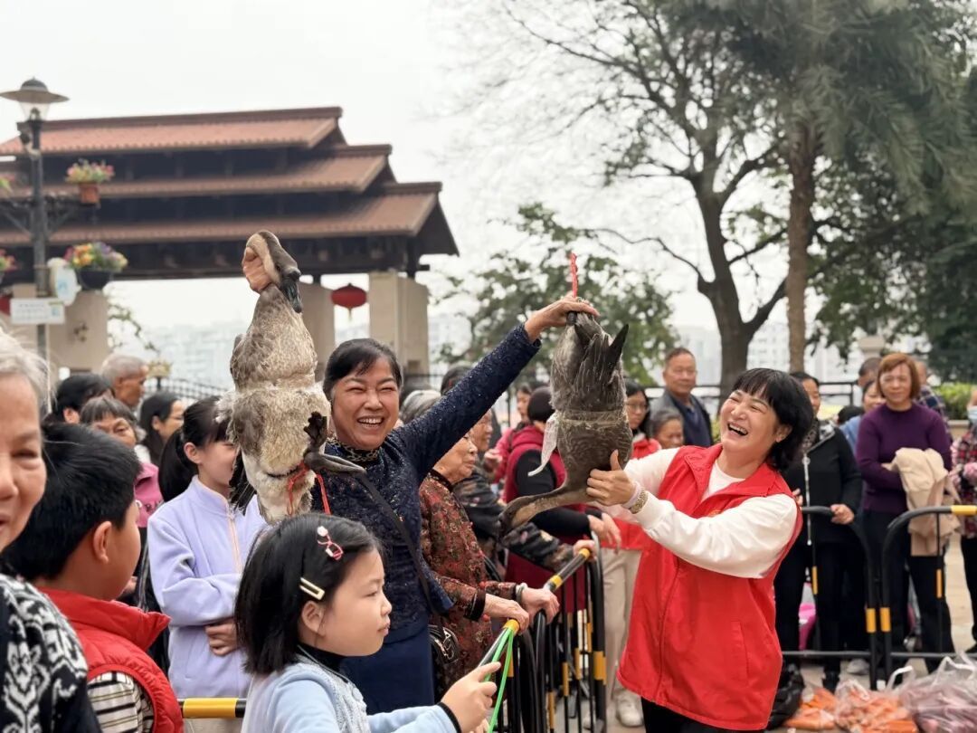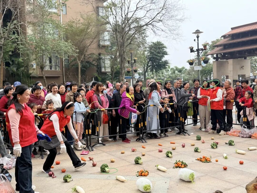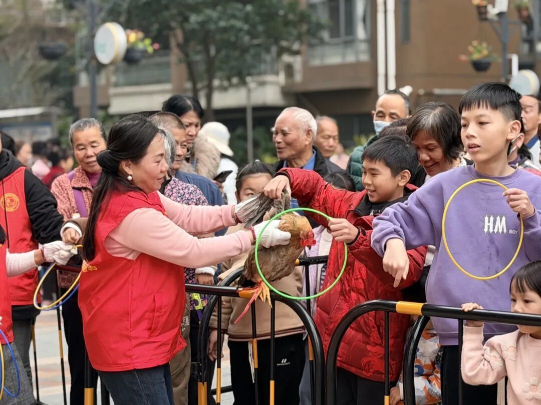 趣味抛圈环节首先拉开帷幕,迅速点燃现场气氛,以欢声笑语传递社区邻里间的温暖情谊。本次抛圈游戏的奖品独具特色,不仅有各类新鲜蔬菜,还准备了鸡、鸭、鹅作为重要奖品。居民们积极参与,有序排队,瞄准目标,奋力投掷,接连成功命中目标,喜笑颜开地抱走心仪的鸡鸭鹅和新鲜蔬菜。大人小孩一同参与,每个人脸上都洋溢着收获的喜悦。在趣味比拼中,大家提前感受到新春的热闹与幸福,也在互动中拉近了邻里之间的距离,使小广场处处充满热闹祥和的氛围。