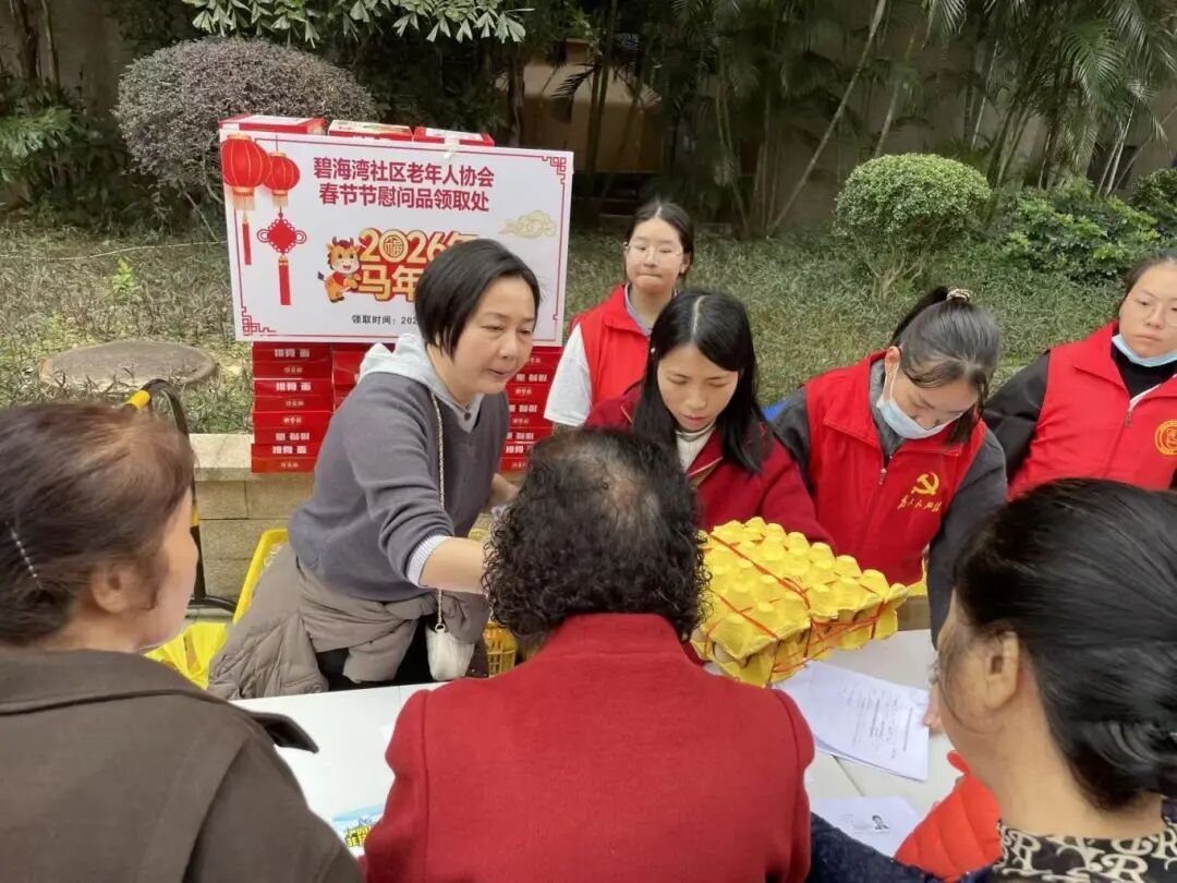 帮扶慰问环节同步推进,以实际行动传递社区关怀。碧海湾社区老年人协会为协会会员精心筹备了鸡蛋、面条等春节慰问物资,一份份慰问物资蕴含着对老年群体的深切关爱,使老人们在寒冷冬日感受到浓郁的节日氛围与社区温情。同时,碧海湾社区格外关注辖区内环卫工人这一特殊群体,碧海湾社区党总支部书记陈思迪为环卫工人们送上包含面条、鸡蛋、春联等在内的慰问物资,向他们日复一日的辛勤劳作致以崇高敬意并送上新春祝福,感谢他们以坚守维护社区的整洁环境。