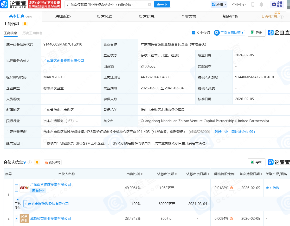 近日,广东南传智造创业投资合伙企业(有限合伙)成立,出资额2130万元,经营范围包含:创业投资(限投资未上市企业)。企查查股权穿透显示,该合伙企业由南方传媒(601900)全资子公司广东南方传媒投资有限公司、成都松苗创业投资有限公司等共同持股。